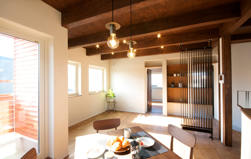 SOCOCOは、ホワイトの金属外装に玄関とバルコニーにはスギの木外装をあしらった外観。室内は無垢材の床に塗り壁仕上げです。LDKはワンルームのようにオープン設計。天井の梁を現しにした個性的な仕上げです。