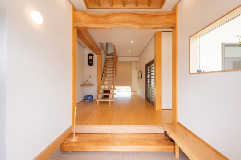 漆喰を使った壁が木の風合いとマッチした玄関。頭上には自然に婉曲した梁が目に飛び込んできます。