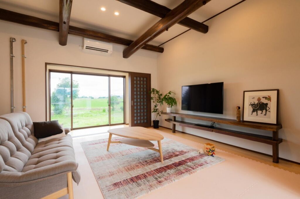 天井には、濃い茶色に着色した古材の丸太梁を使用。テレビボードは、カツラで造作したものです。引き継がれた歴史を感じる現代和風のリビングです。