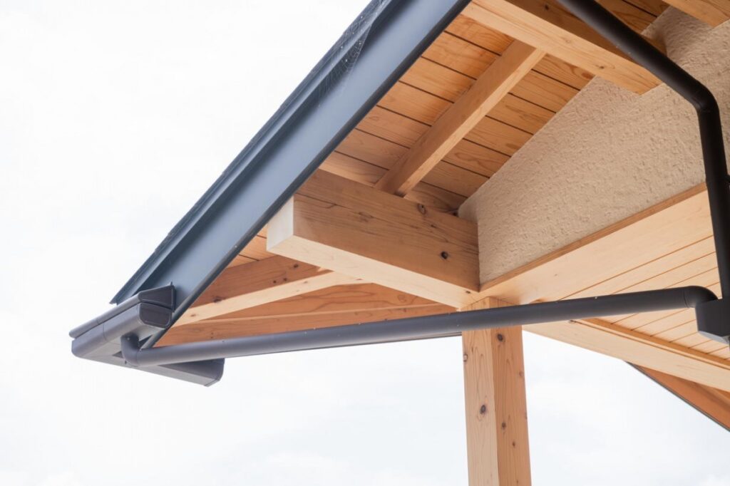 外観にもひと工夫しました。外壁は美しさと耐久性の評価が高い塗り壁、右側の軒先には、見えるように古材の梁をわたしています。伝統的な建築の中にもモダンでスマートな要素を取り入れた外観に仕上げました。