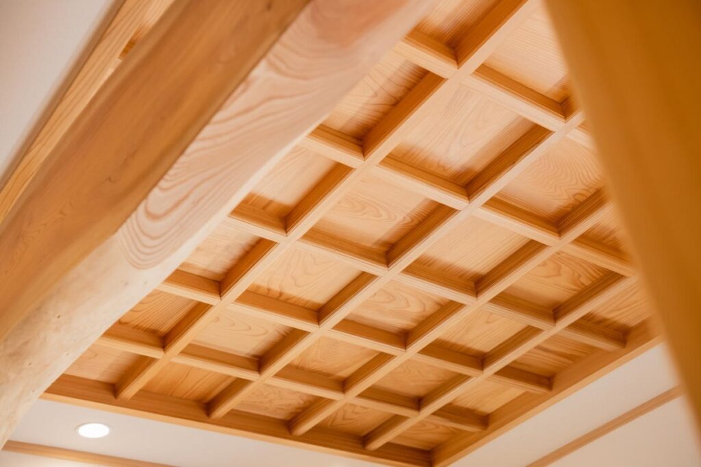 玄関の天井にも、格子状に組んだ格天井(ごうてんじょう)にケヤキが使われています。ケヤキは大黒柱や階段にも利用しています。