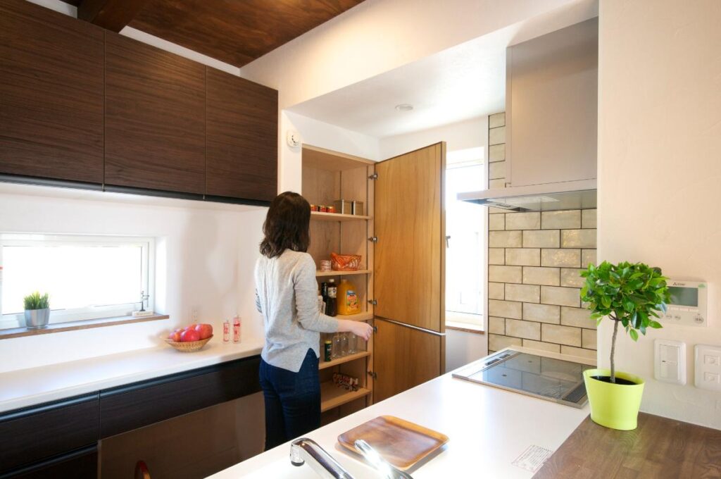 キッチンには、背面収納の隣に、電気を使わず冬の冷気で庫内を冷やす保冷庫も設置しました。
